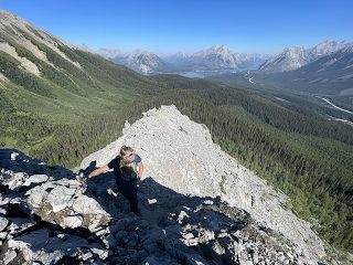 Mount Niblock was a generally fun endeavor composed of sections of scrambling, a bit of exhilarating exposure, and an airy view of the surrounding mountains from the summit zone. The adventure begins from the standard viewing area for Lake Louise, which is an amazing sight in its own right. An hour or so of hiking brought Carly and I to the Lake Agnes Teahouse. We took a brief break at this spot, and then began making our way uphill through a glacially carved valley/cirque. Scree and boulders became more numerous, and steepness reached an apex at the base of a cliff band. There is a weakness through the cliffs, such that anything resembling climbing didn't exceed class 3, though there was mild exposure at times.